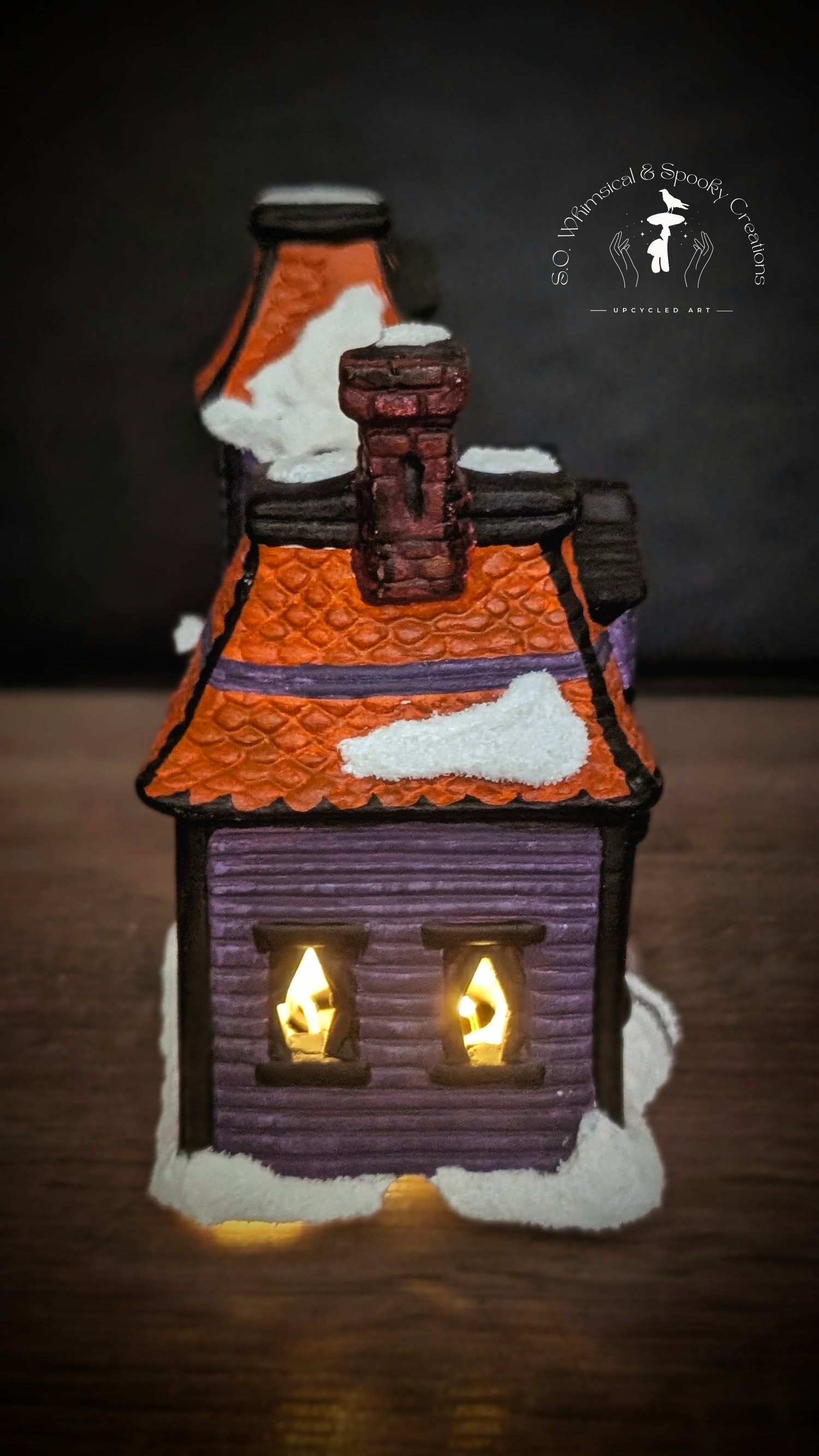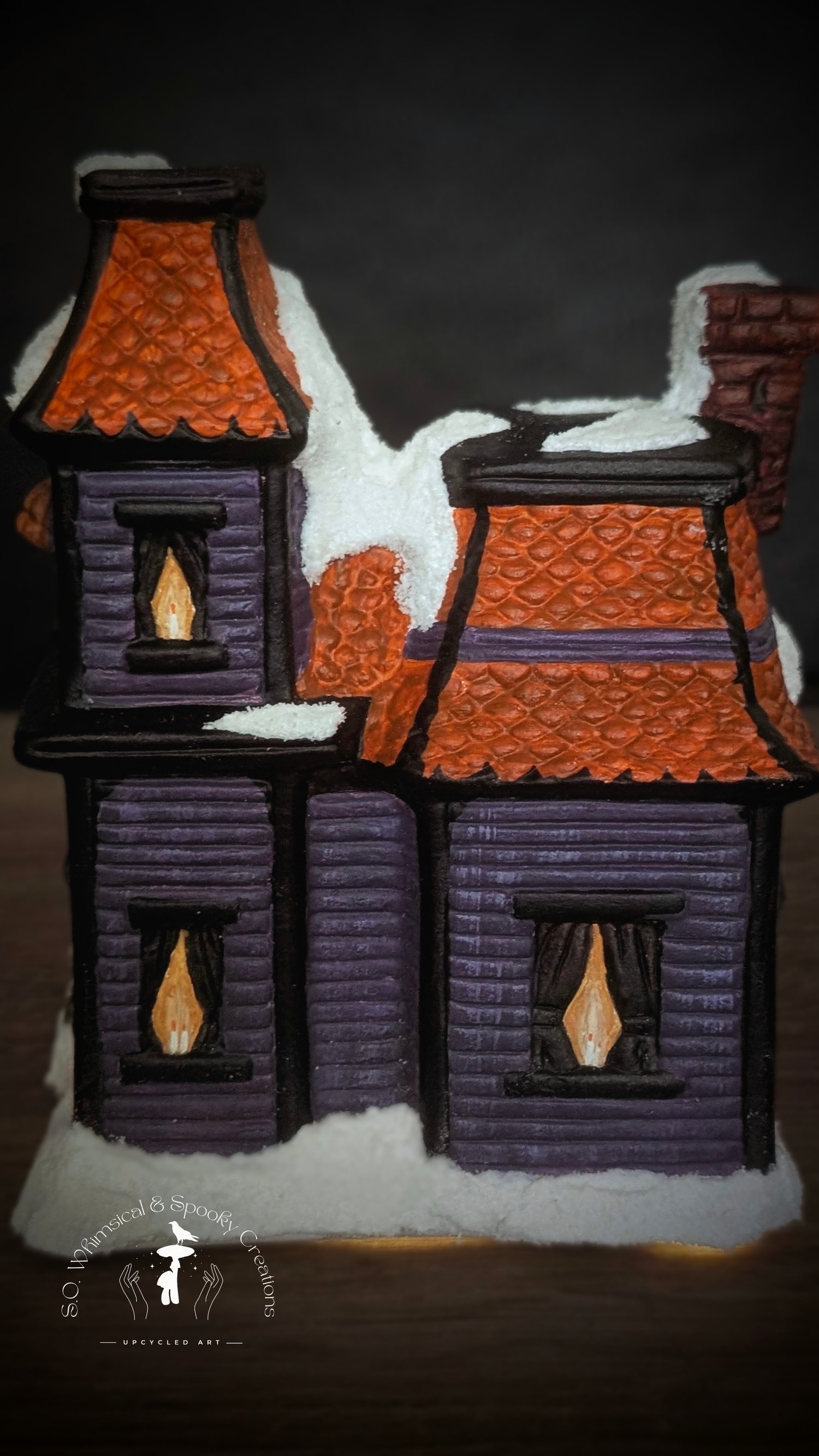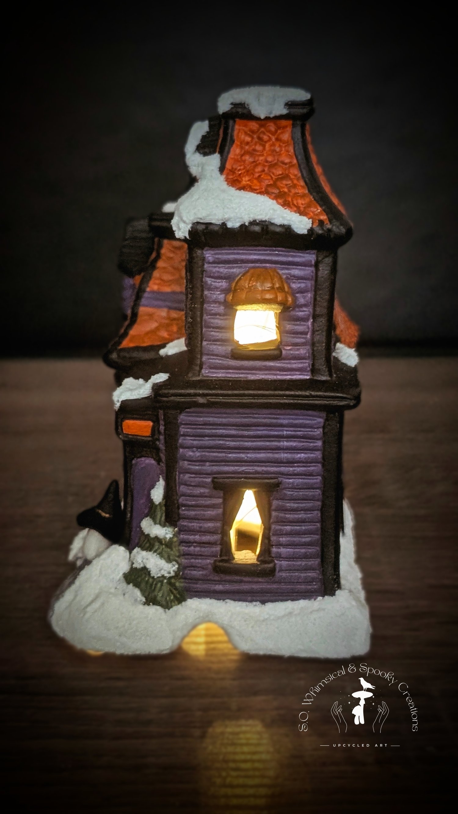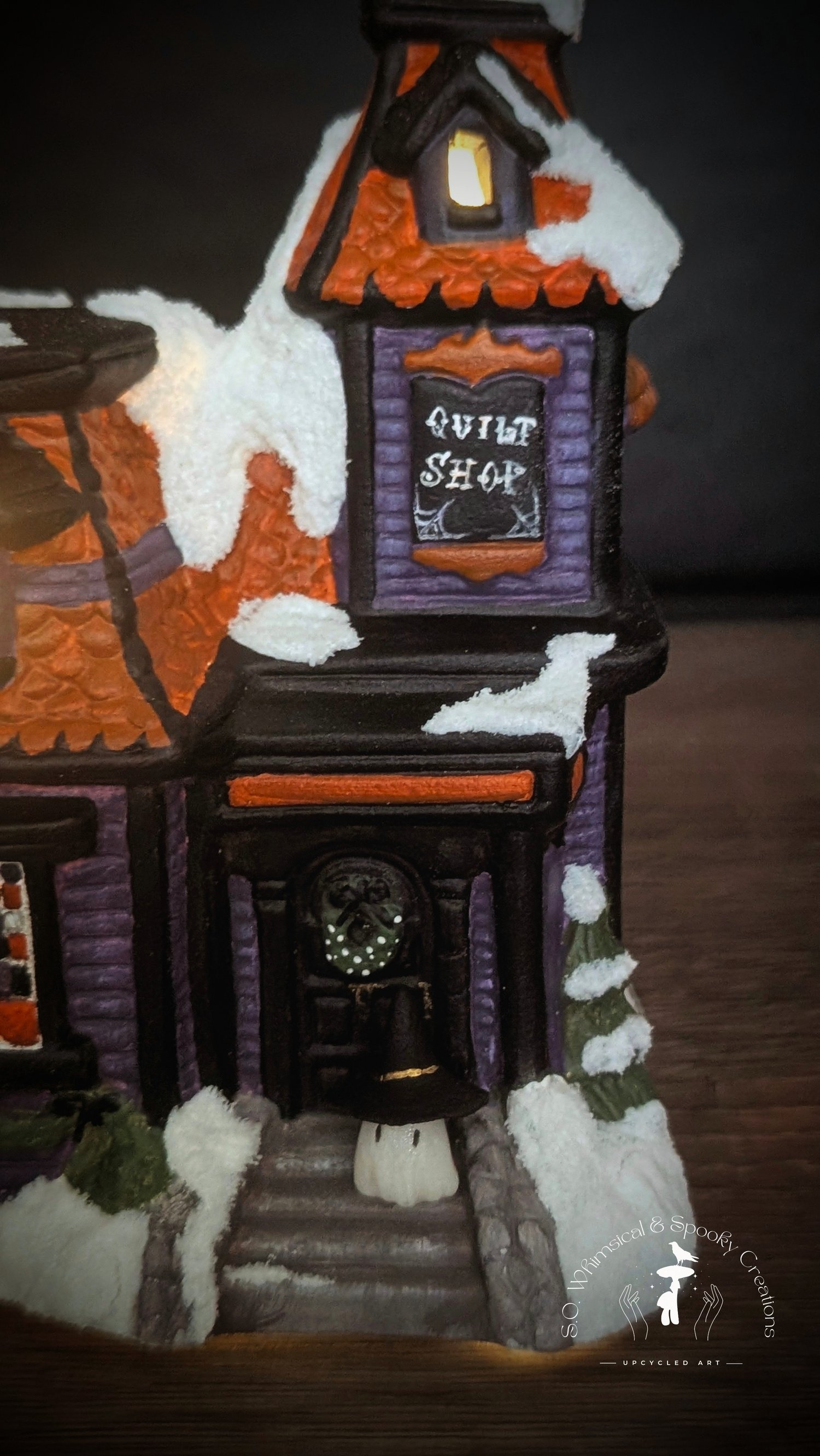 I transformed this porcelain building into a magical, witchy Quilt Shop. Starting with a primed base, I hand painted this building with all of its whimsical details. I then sculpted a tiny ghost witch with her hat and applied mounds of my snow texture.